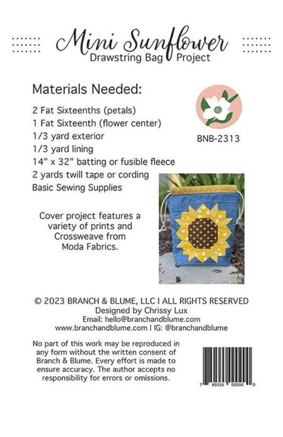 - Tags: Bag Pattern, BNB-2313, Branch & Blume, Drawstring, fabric, Mini Sunflower, pattern, Quilting Notions,