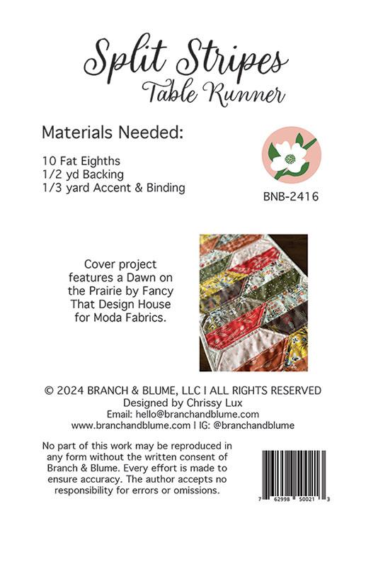 The Split Stripes Table Runner by Branch & Blume is a stylish and modern project that adds a bold statement to any table setting. Designed under pattern number BNB 2416, it features clean lines and contrasting fabric strips for a visually dynamic look. This pattern is perfect for showcasing your favorite fabric combinations, whether seasonal or everyday. With a finished size of 12.5" x 40.5", it fits beautifully on dining or console tables. Easy to piece and fun to sew, it's a great project for confident beginners and experienced quilters alike.