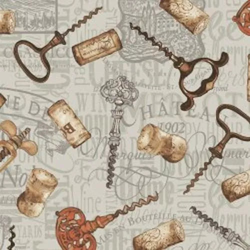 Wine Night Tossed Cork Screw Grey Mary Beth Baker Henry Glass Cotton Fabric