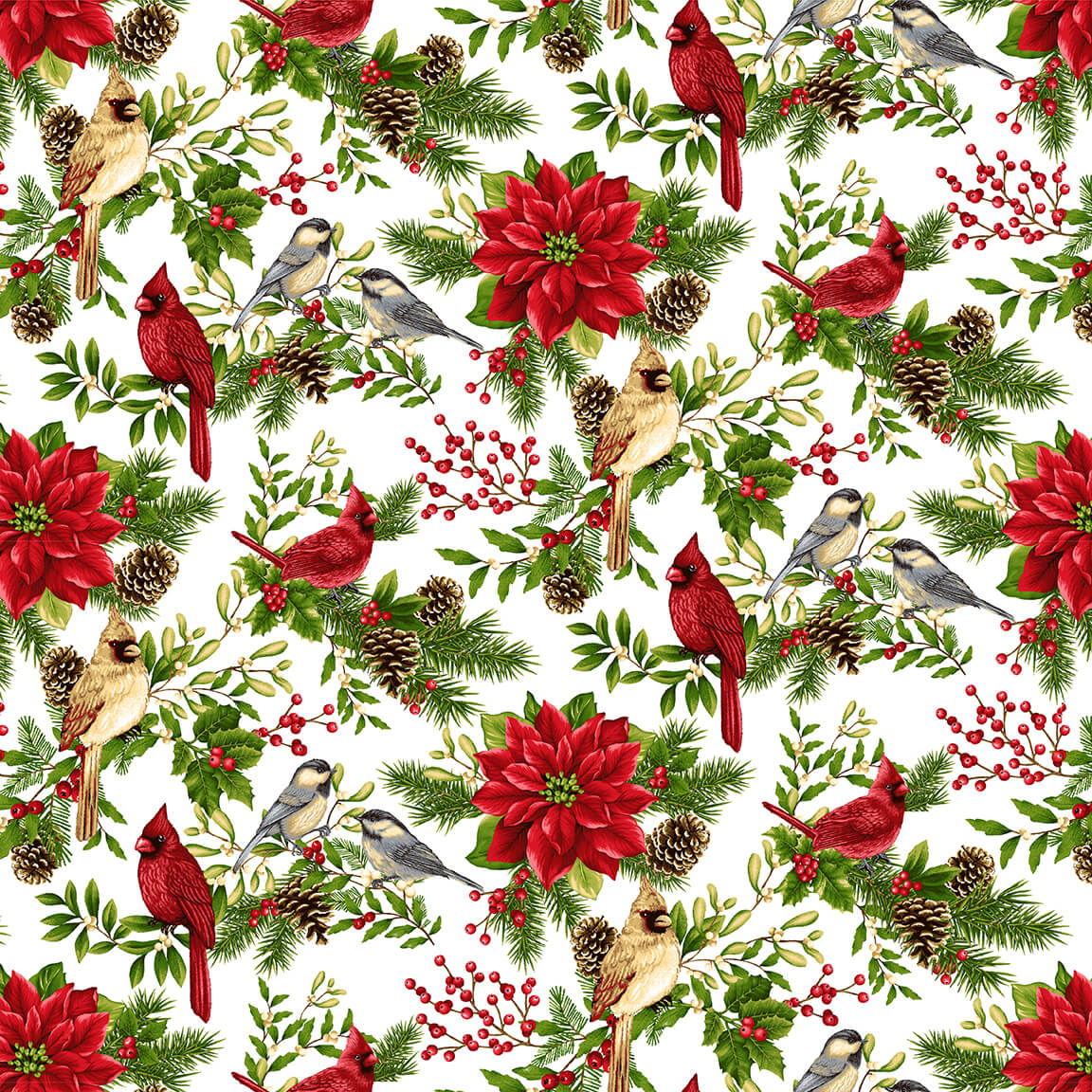Winter Garden Birds and Branches Red Cardinal Poinsettia Mistletoe on Cream by Color Principle for Henry Glass 44 inches wide 100% Cotton Quilting Fabric HG-2830-33