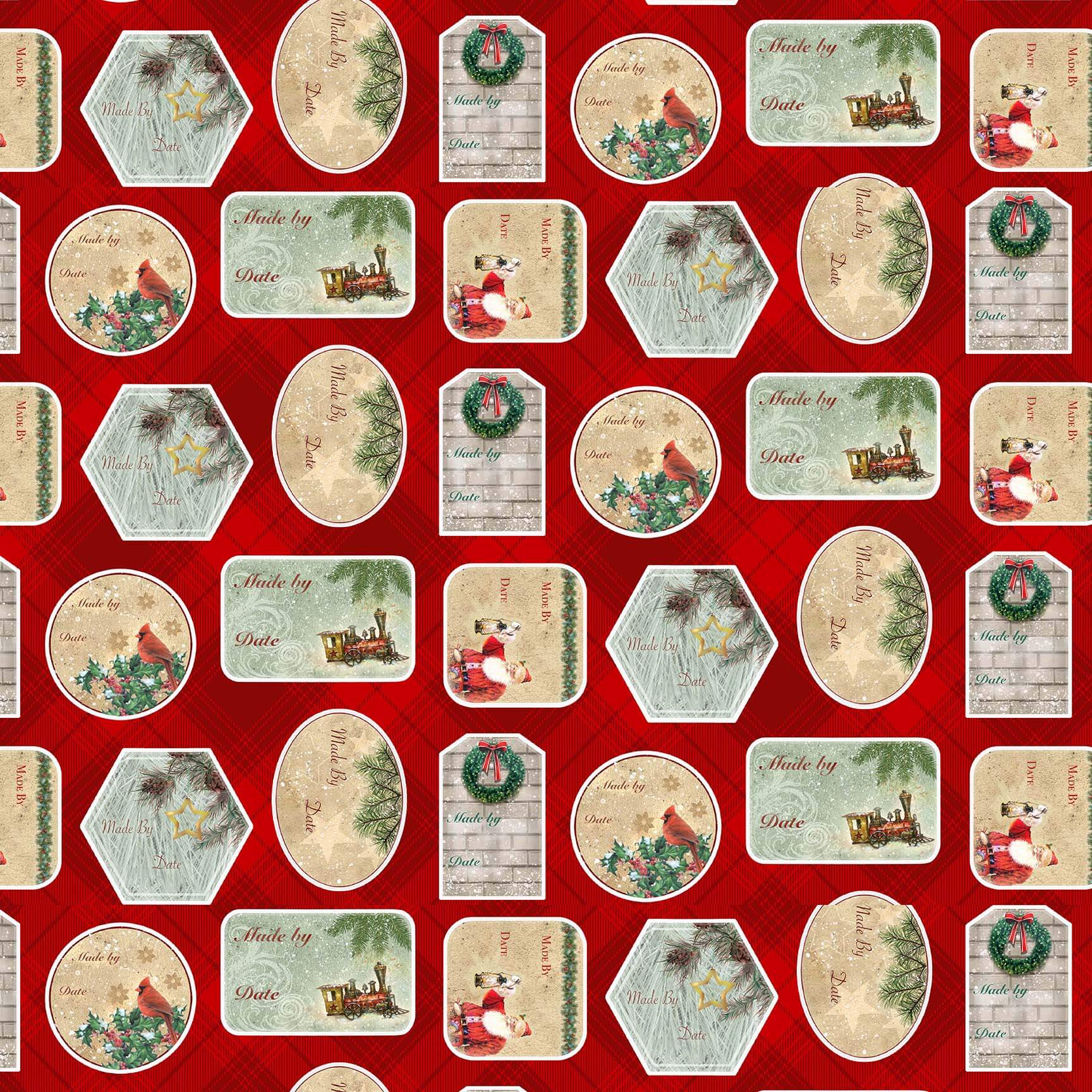 Old Saint Nick Christmas Labels in Red by Robert Giordano for Henry Glass Fabrics 44 inches 100% Cotton Quilting Fabric HG-765-88