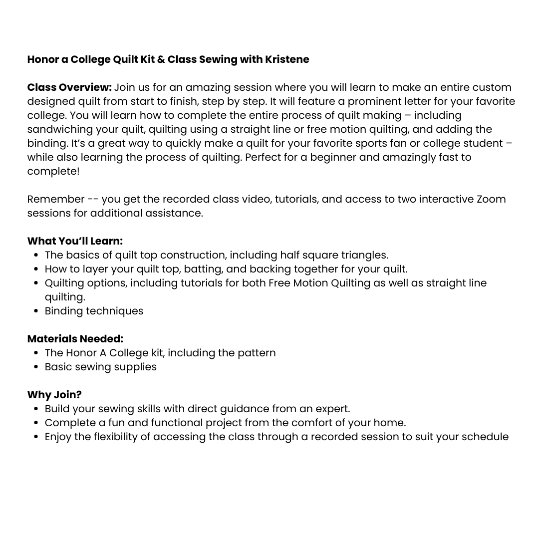 This is a complete kit with all of the supplies needed for you to quickly make a quilt for your favorite sports fan, college student, or yourself utilizing a preprinted panel for the quilt top! It also comes with a video class, tutorials, and two interactive sessions where you can ask questions and get assistance.