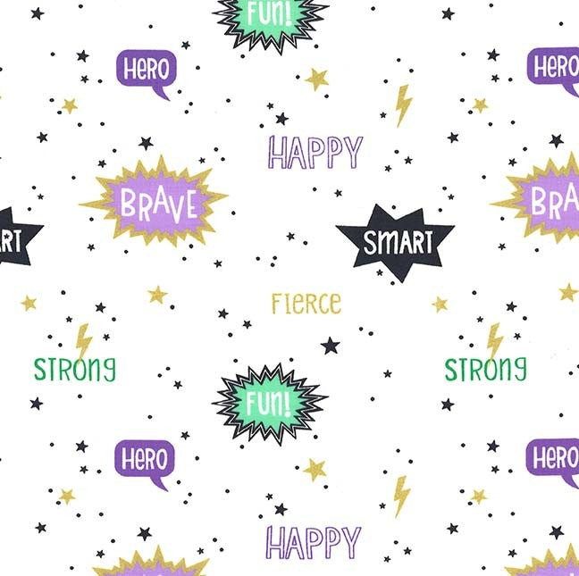- Tags: Brave, Cotton, fabric, Fun Hero, Happy, Michael Miller, MM DHM8377-VENU, Quilting, Smart, Strong, White, Words,