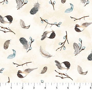Feathered Nest Tossed Chicadees and Feathers in Cream designed by Northcott Fabrics 44 inches wide 100% Cotton Quilting Fabric NC-24396-11