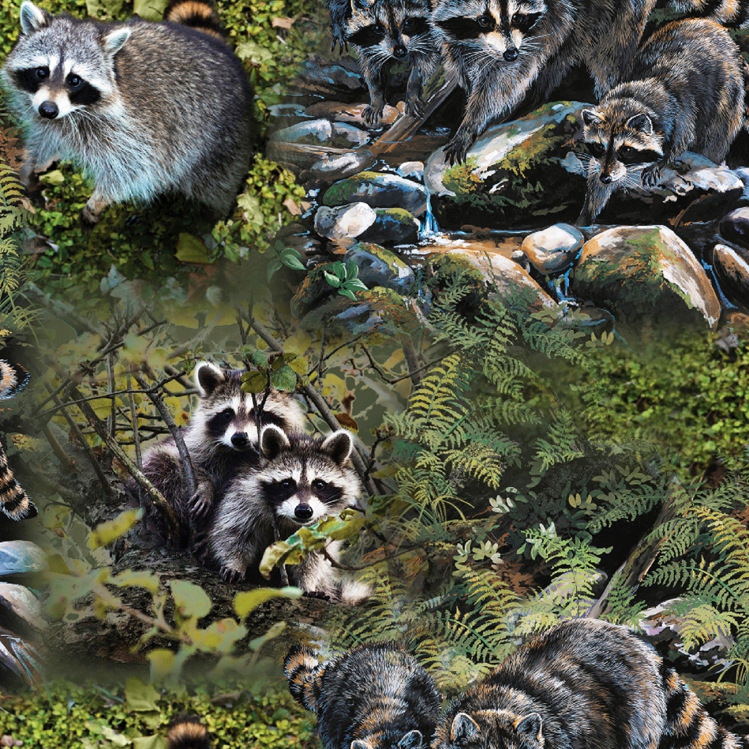 This digitally printed cotton fabric features stunning raccoons in a woodland scene. This lightweight fabric is easy to sew has a soft hand and is very versatile! It is ideal for quilting but can also be used for crafts miscellaneous sewing projects or home decor items like pillow covers and bed skirts. This is a licensed product and is intended for personal use only. Any unauthorized use is prohibited.