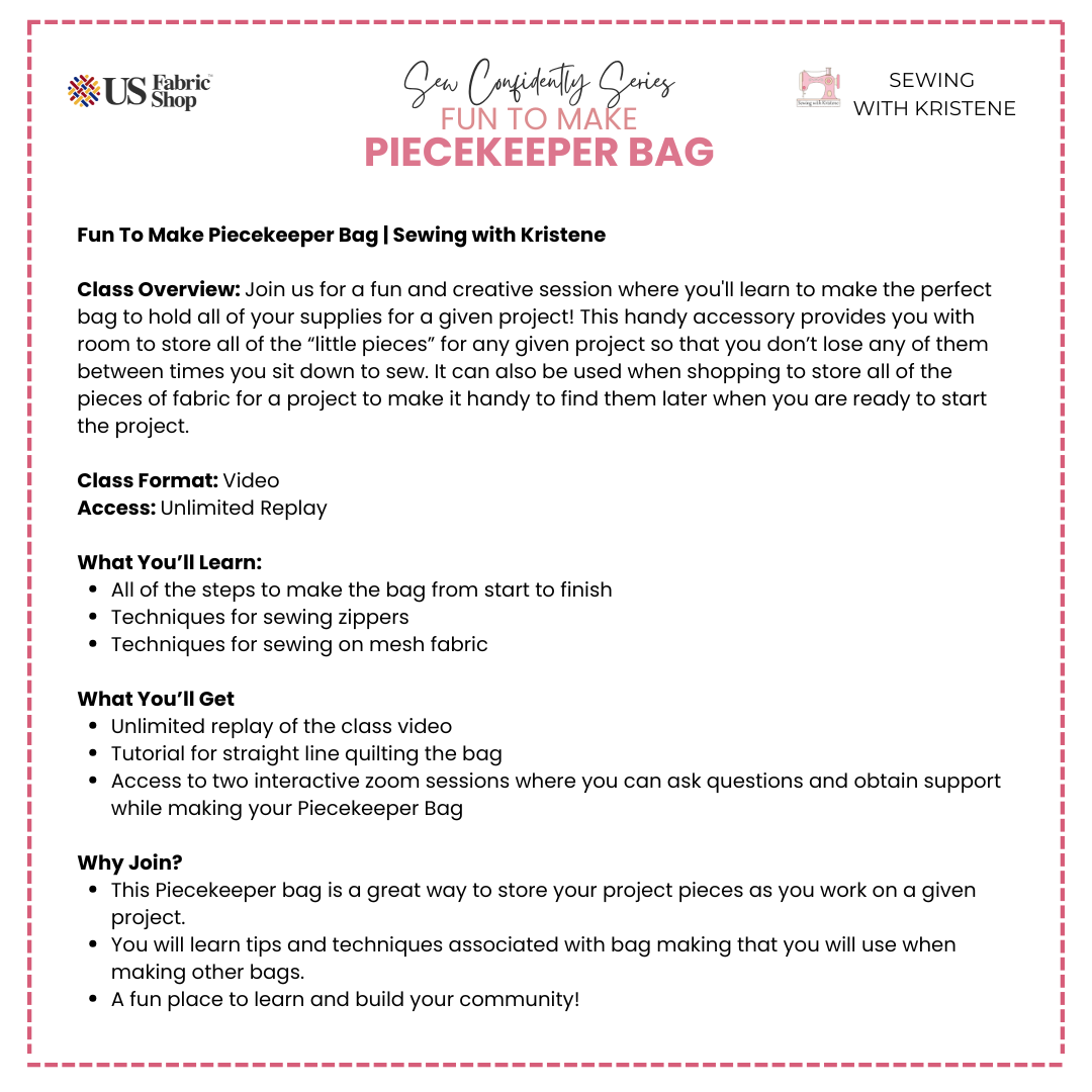 - Access to two interactive zoom sessions where you can ask questions and obtain support while making your Piecekeeper Bag