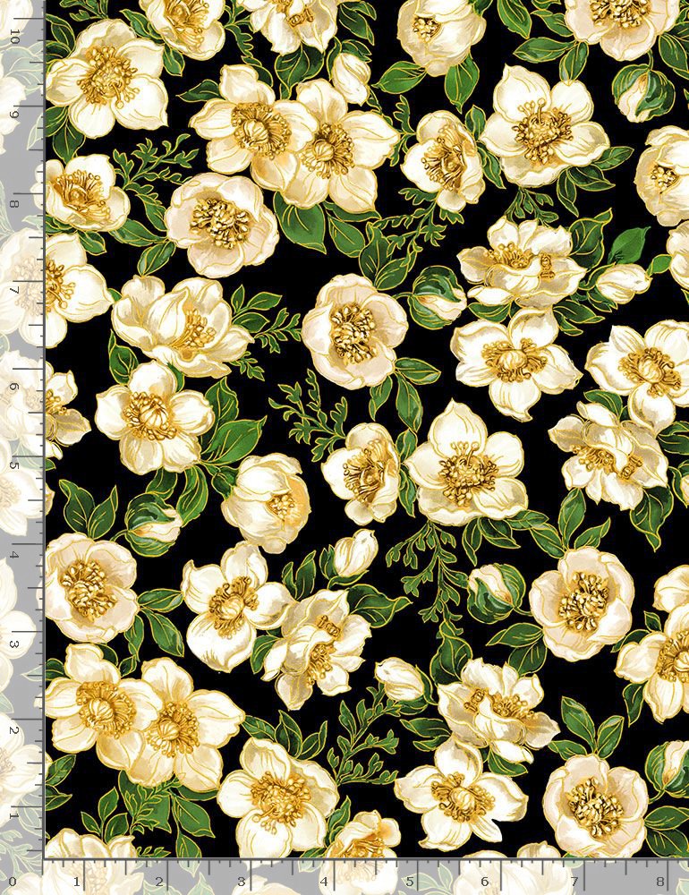 Christmas Joy White Hellebore Blooms Metallic Black Timeless Treasures Cotton Fabric TT-CM1283 Black