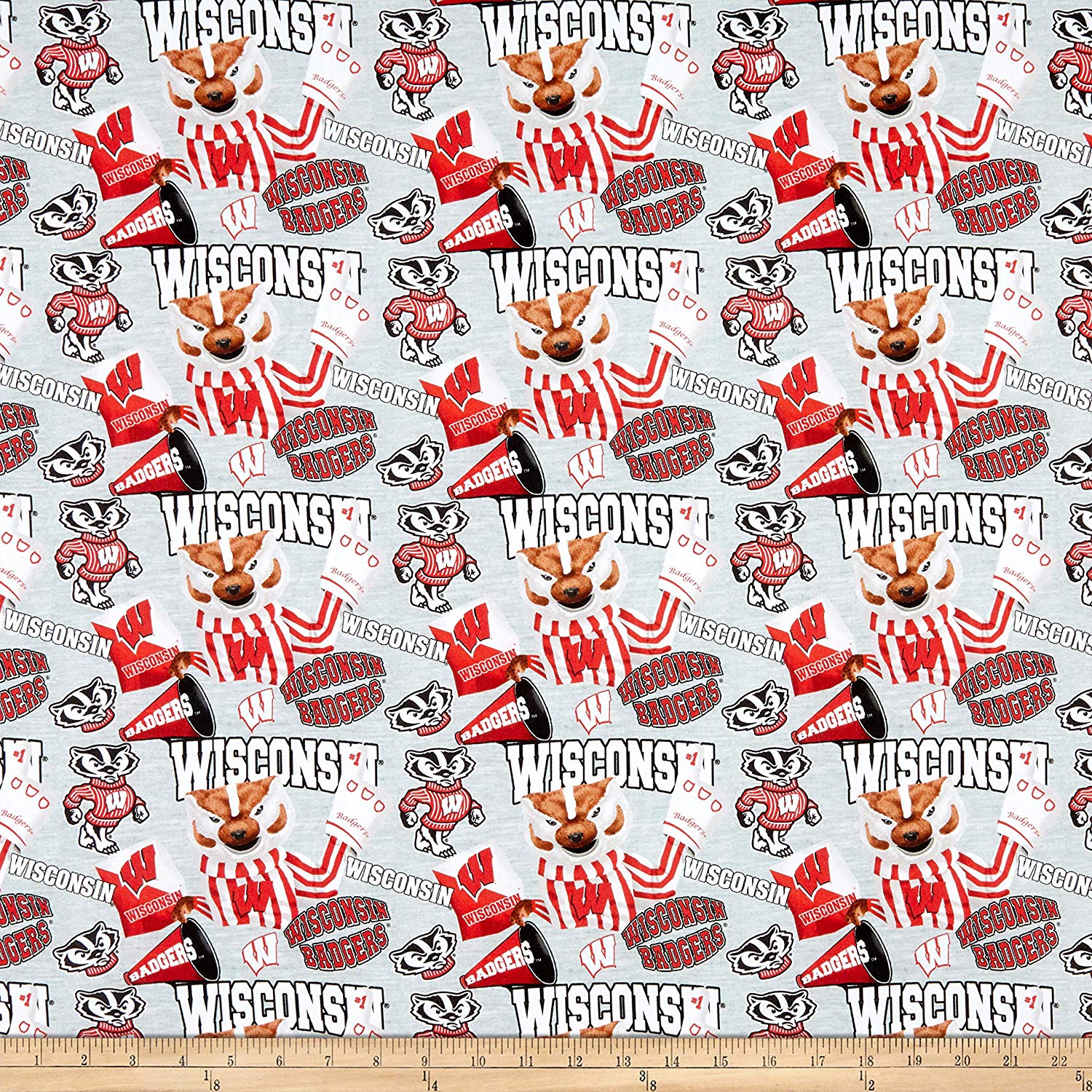 Wisconsin Badgers NCAA Collegiate Mascot on Gray Heather Print Design 43 inches wide 100% Cotton fabric. Cheer on the Badgers!