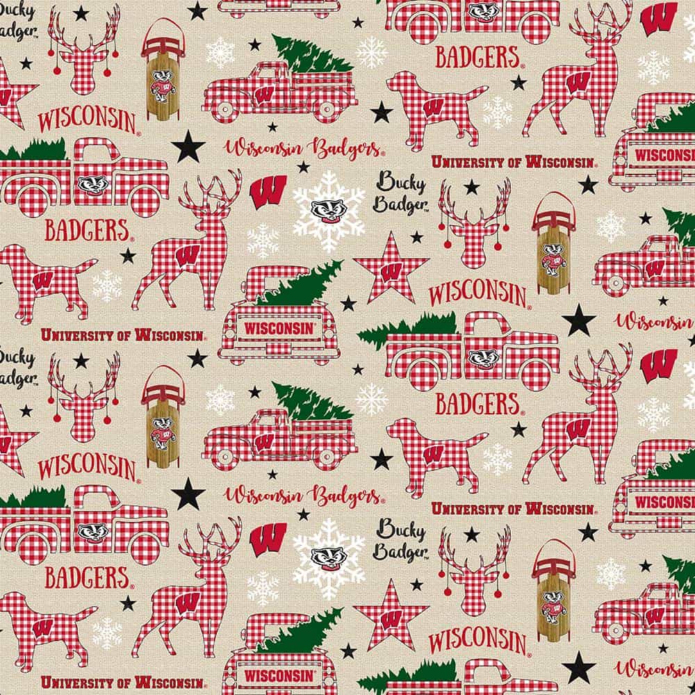 Wisconsin Badgers NCAA Christmas Holiday Design 43 inches wide 100% Cotton fabric. Cheer on the Badgers!